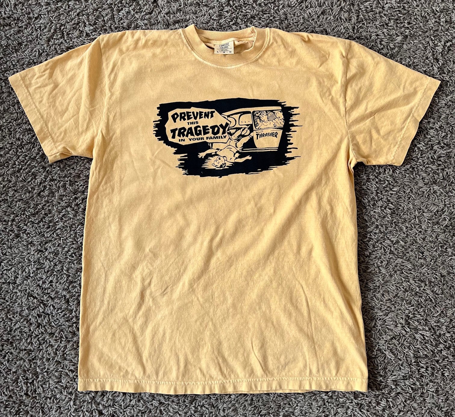 Screened the old Thrasher Magazine Prevent this Tragedy shirt. Screenprinted with water soluble inks. Used Comfort Colors cotton shirts.